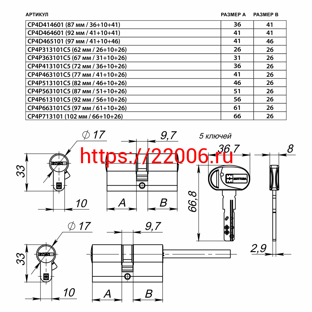 - Цилиндровый механизм Mottura (Моттура) под вертушку (дл. шток) CP4P663101C5 (97 мм/61+10+26) МАТ.НИКЕЛЬ в Самаре недорого